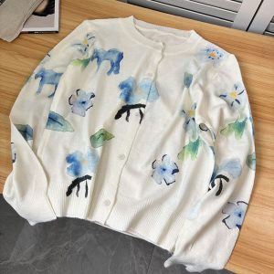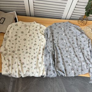 • Belknt-Korean Mini Flowers Printed Knitted Cardigan for Women-Crew Neck Super Thin Knitwear Short Top-Cute Outfit
