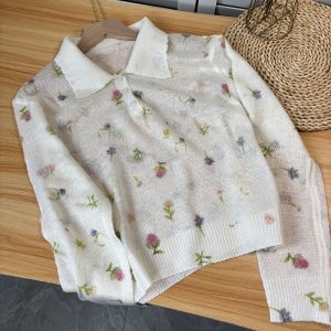 • Belknt-Korean Mini Flowers Printed Knitted Short Knitwear for Women-Polo Collar Super Thin Sweater Short Top-Cute Outfit