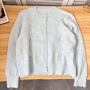 • Belknt-Sweet Wavy Edge Solid Knitted Cardigan Short Knitwear for Women-Hollowed Out Thin Bow Tie Sweater Short Coat-Cute Knitted Tops Outfit