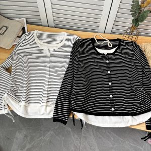 • Belknt-Renaissance Stripes Two Pieces Knitted Cardigan Short Knitwear for Women-Drawstring Design waist Thin Sweater Short Coat-Cute Knitted Tops Outfit