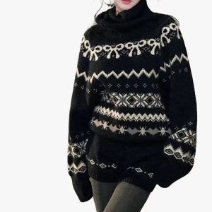• Belknt-Korean Style Cartoon Jacquard Pullover Knitted Sweater Top for women-Roll Edge Atmospheric knitwear Coat for Lady