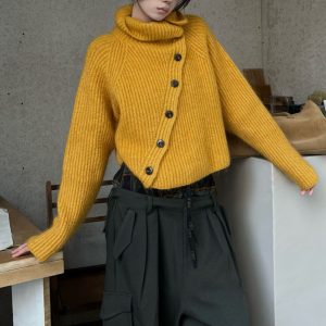 • Belknt-Irregular Solid Knitted Cardigan Top for Women-High Collar Thick Sweater Coat for Lady-Single Buttons