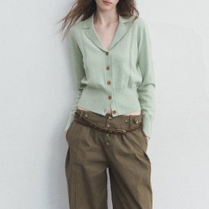 • Belknt-Solid Green Knitted Cardigan Short Knitwear for Women-Suits Collar Thin Sweater Short Coat-Retro Knitted Tops Outfit