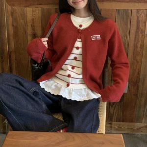 • Belknt-Two Pieces Red Knitted Cardigan Coat for Women-Korean Patch Crew neck Sweater Top for Girls-Knitwear Cannot be separated