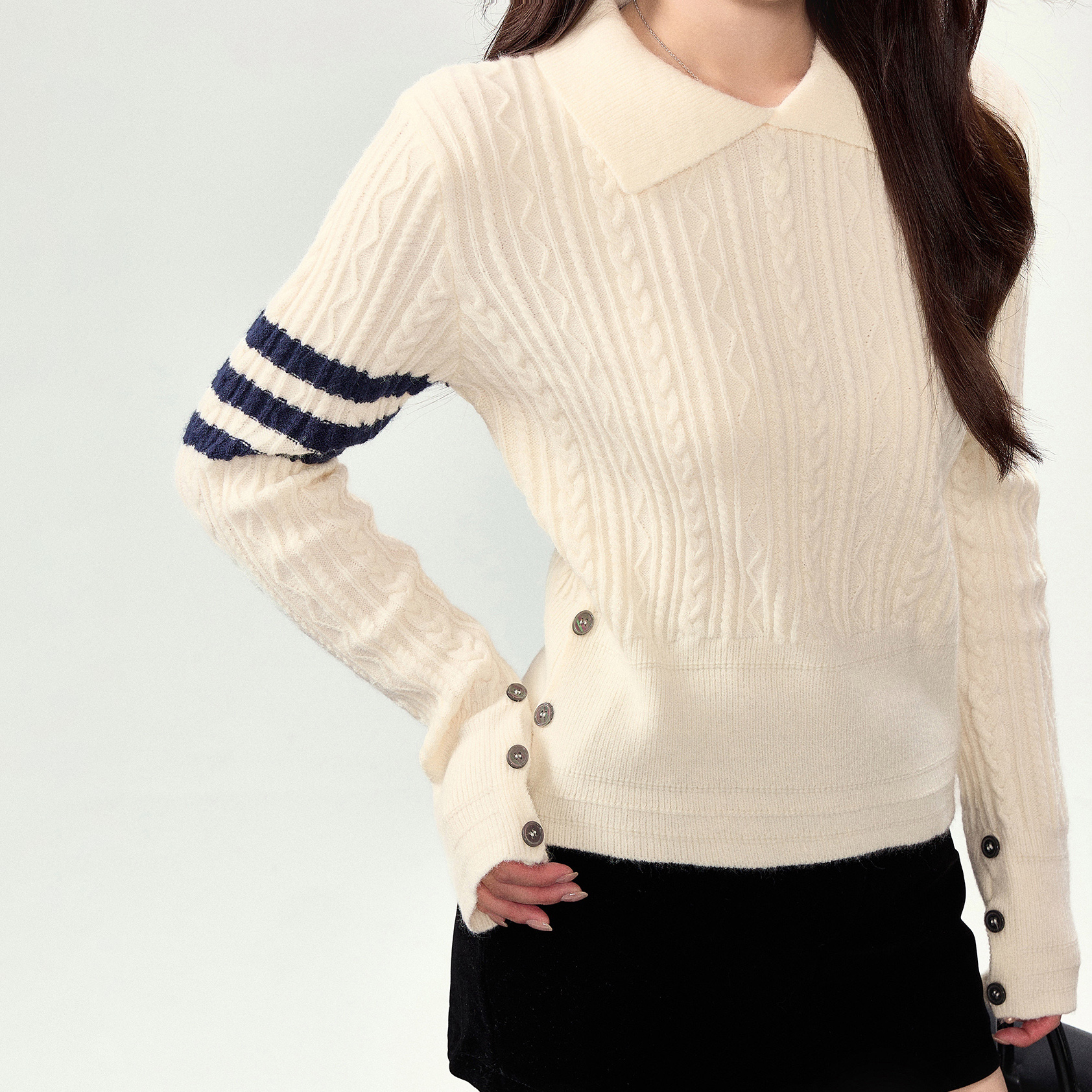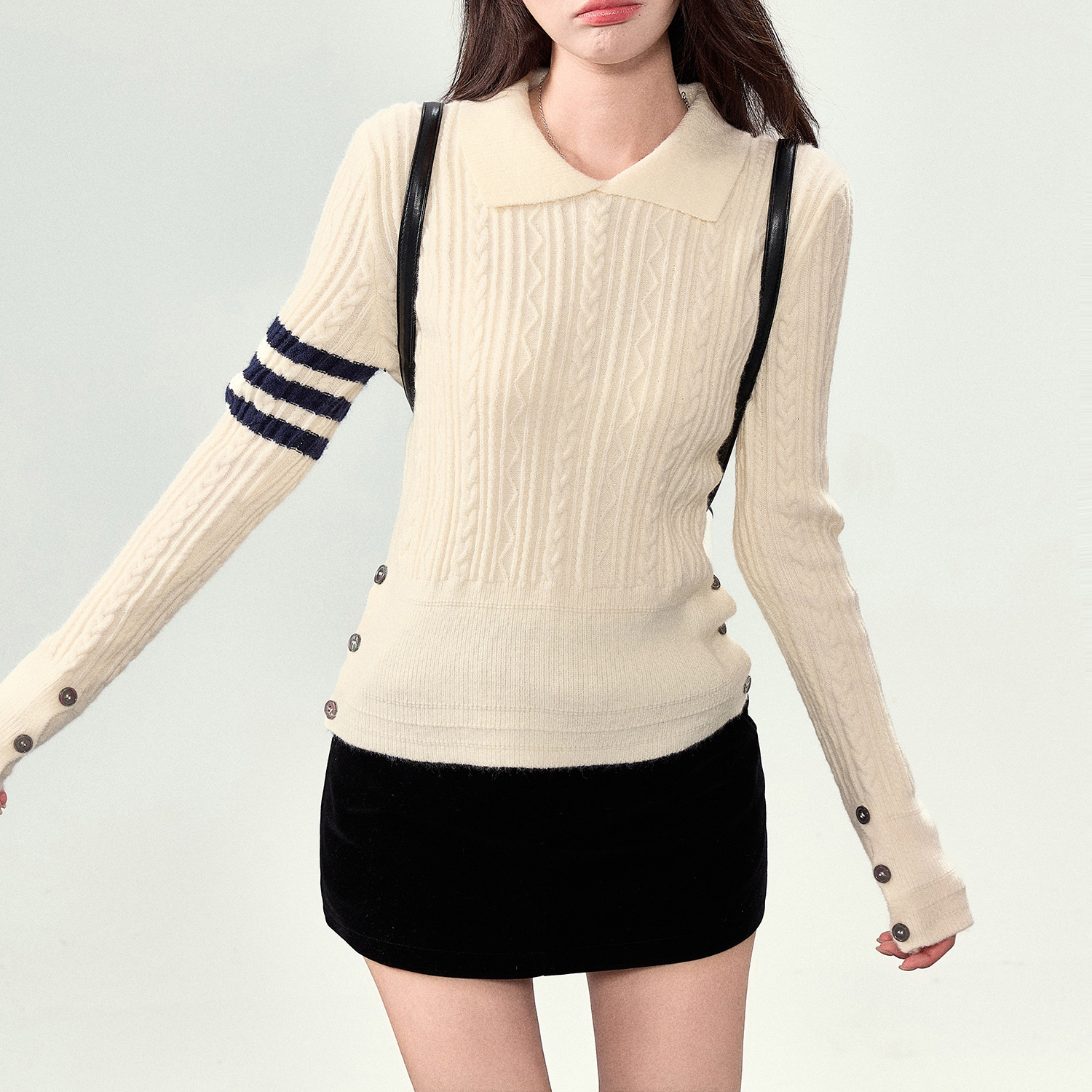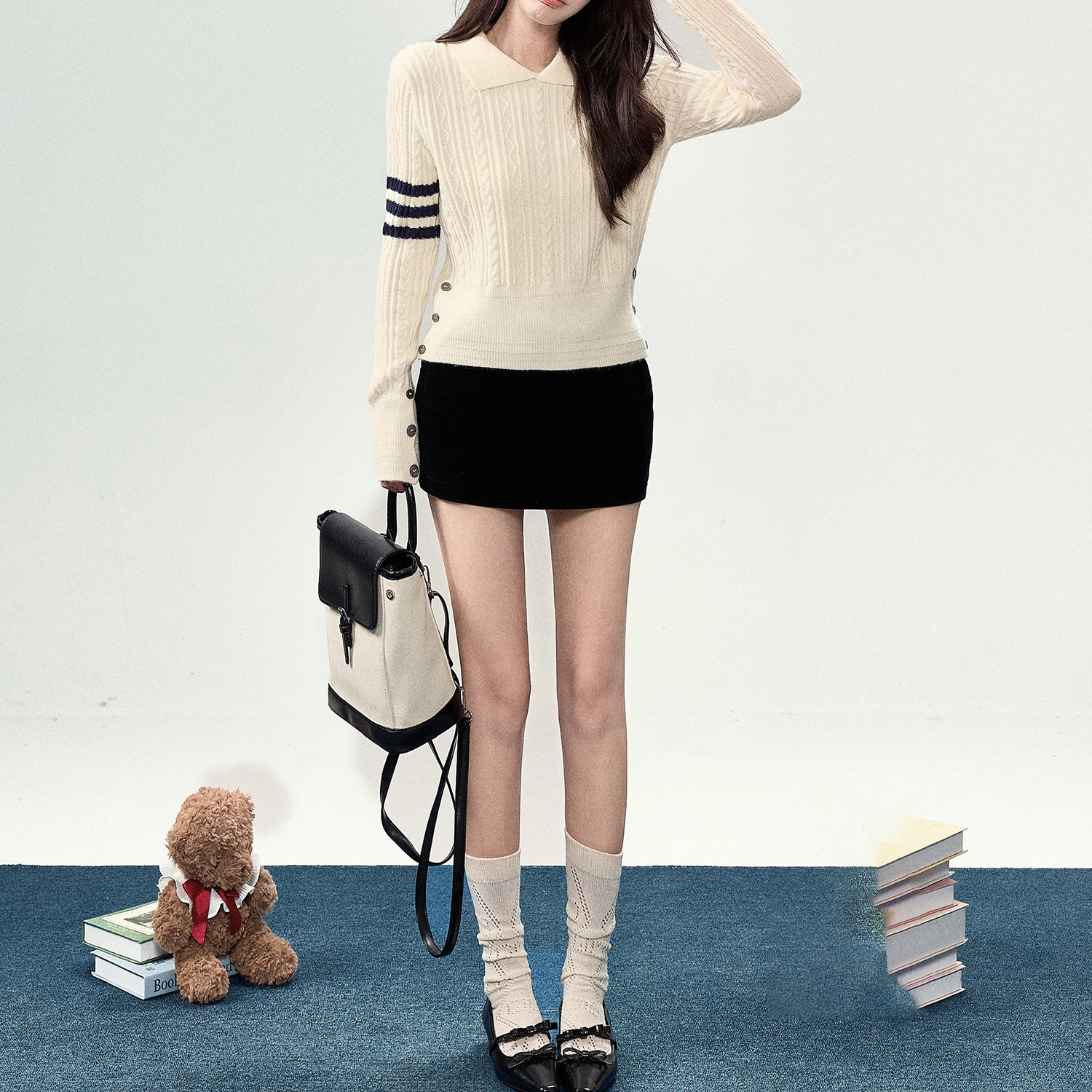 Belknt-Solid Polo Collar Pullover Knitted Top for Women-Tb Style Three Stripes Thin Sweater Short Coat