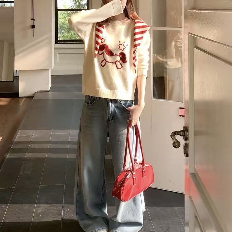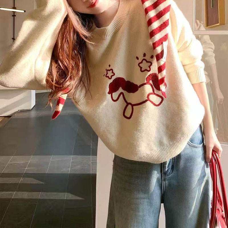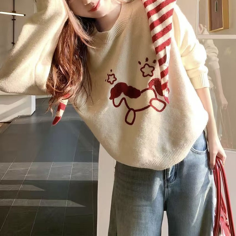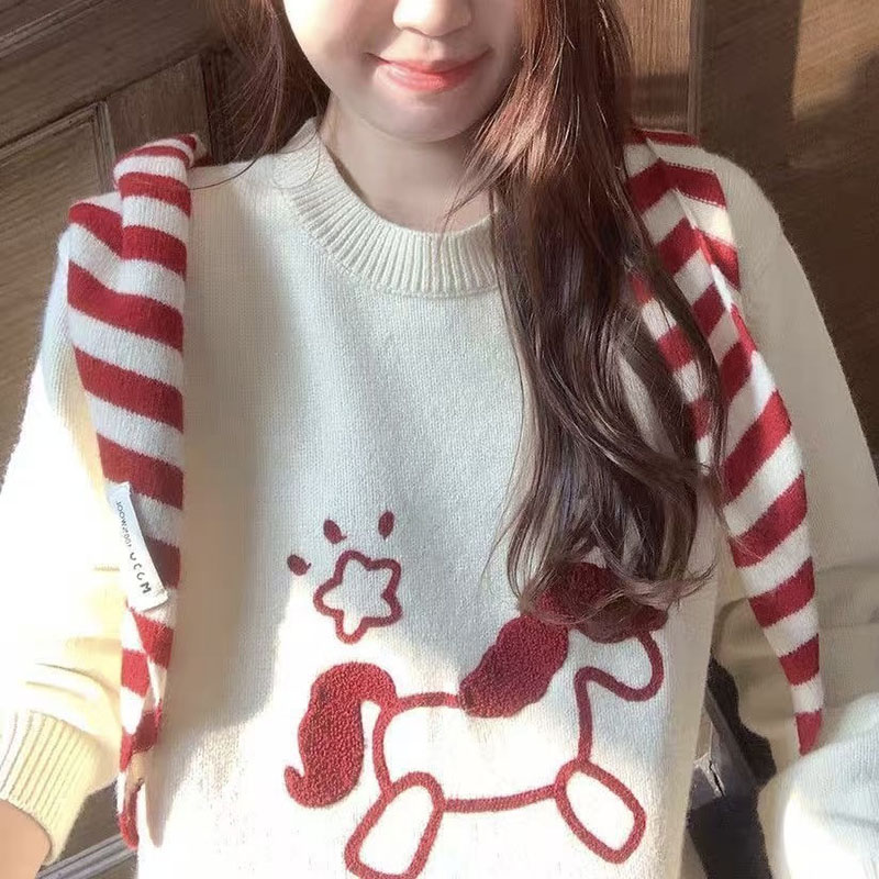 Belknt-Age Reducing Embroidery Pullover Knitted Sweater Top for Women-White Horse Loose Long Sleeve Crew neck Coat Knitwear for Girls