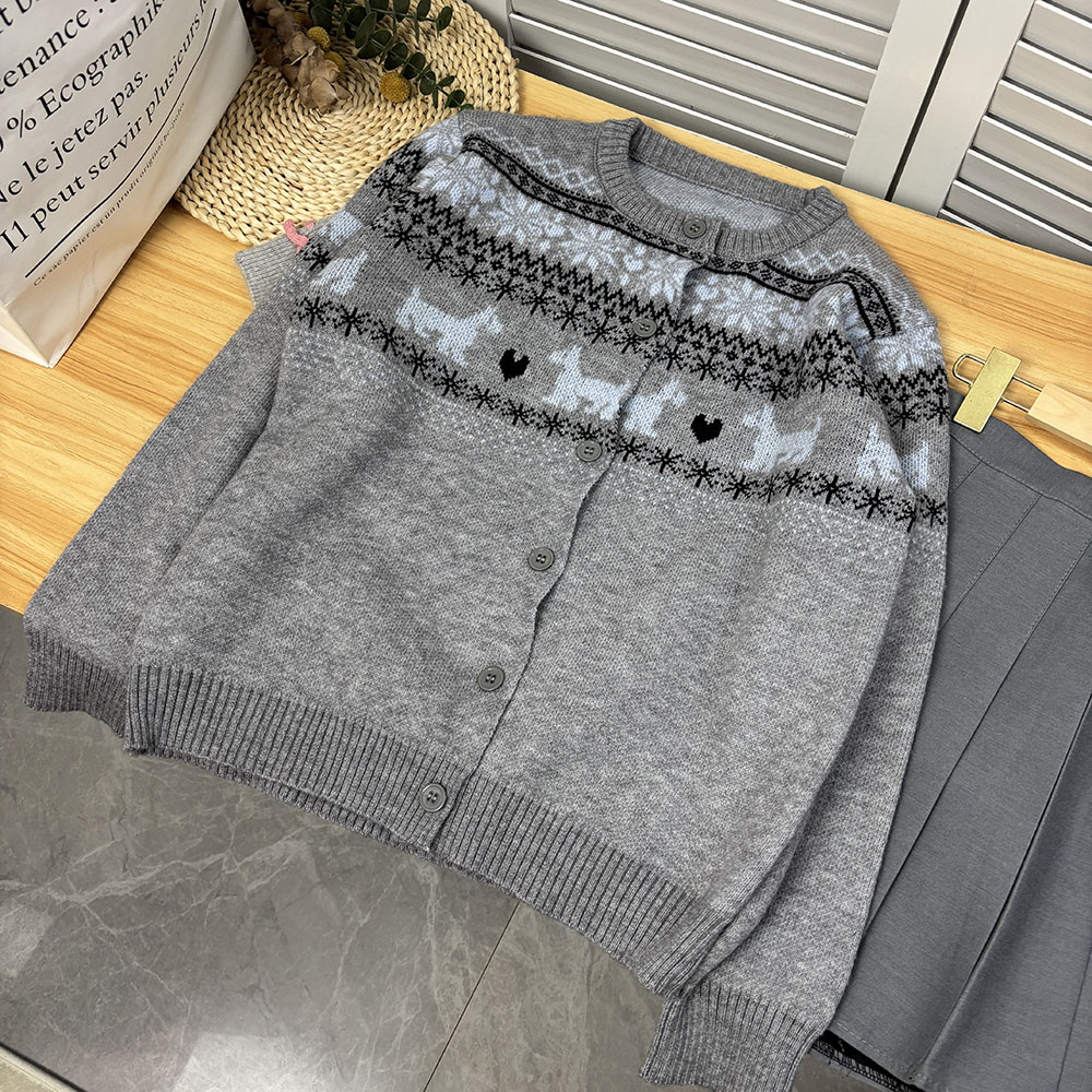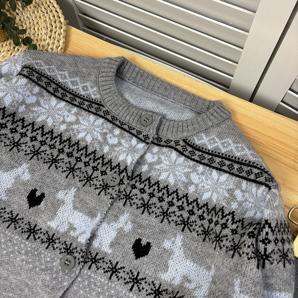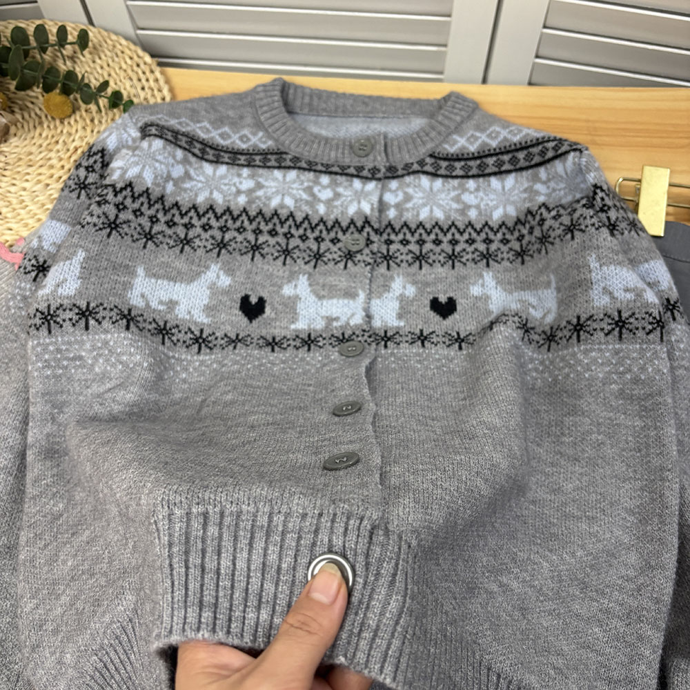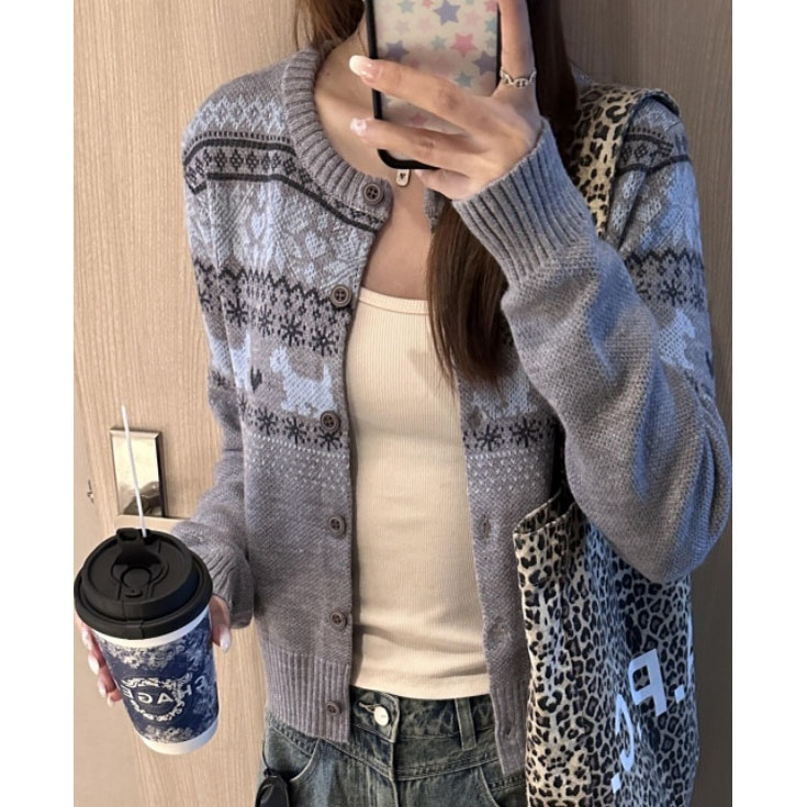 Belknt-Fair Island Gray Knitted Cardigan Knitwear for Women-Round neck Thin Sweater Short Coat-Retro Knitted Tops Outfit