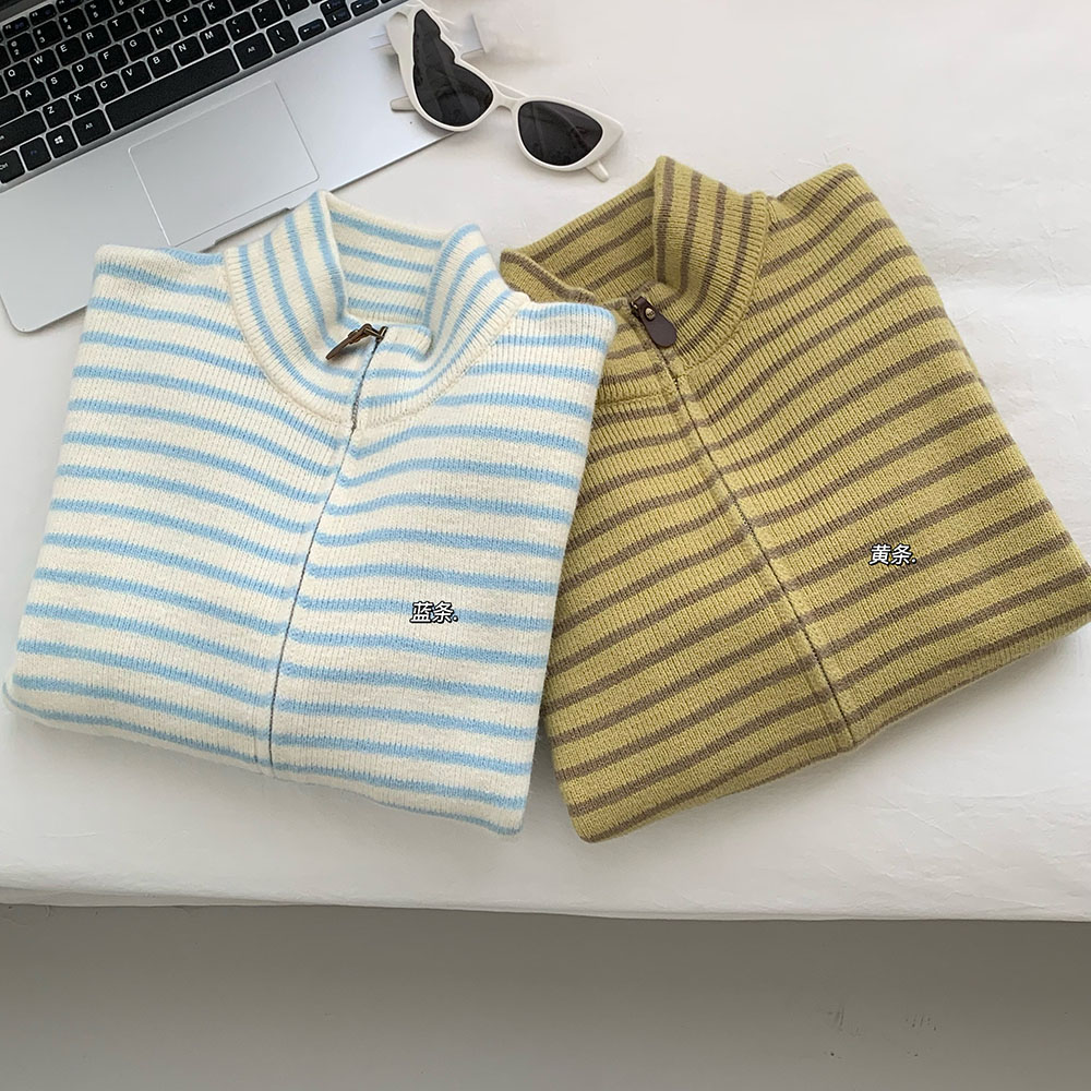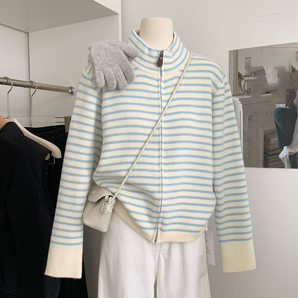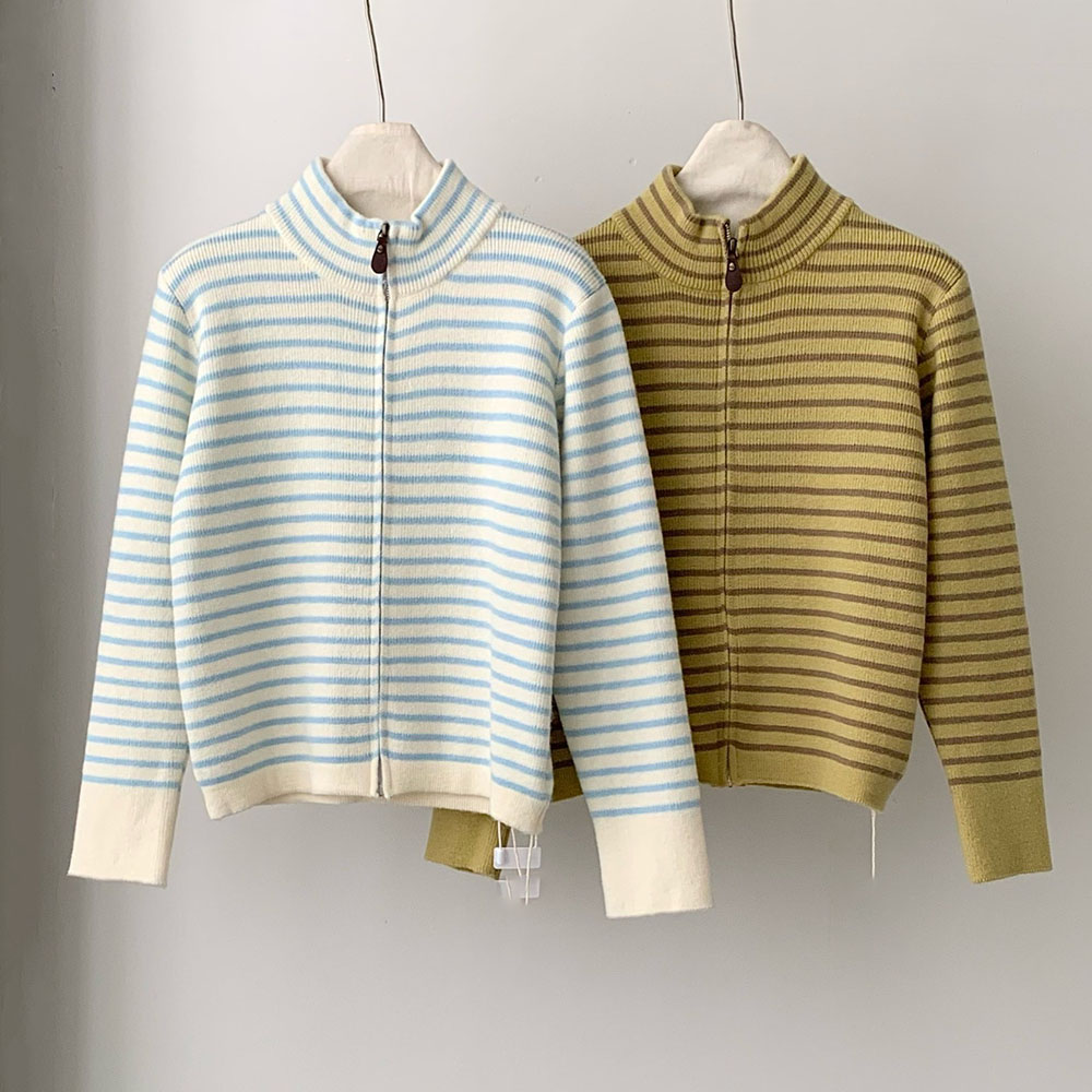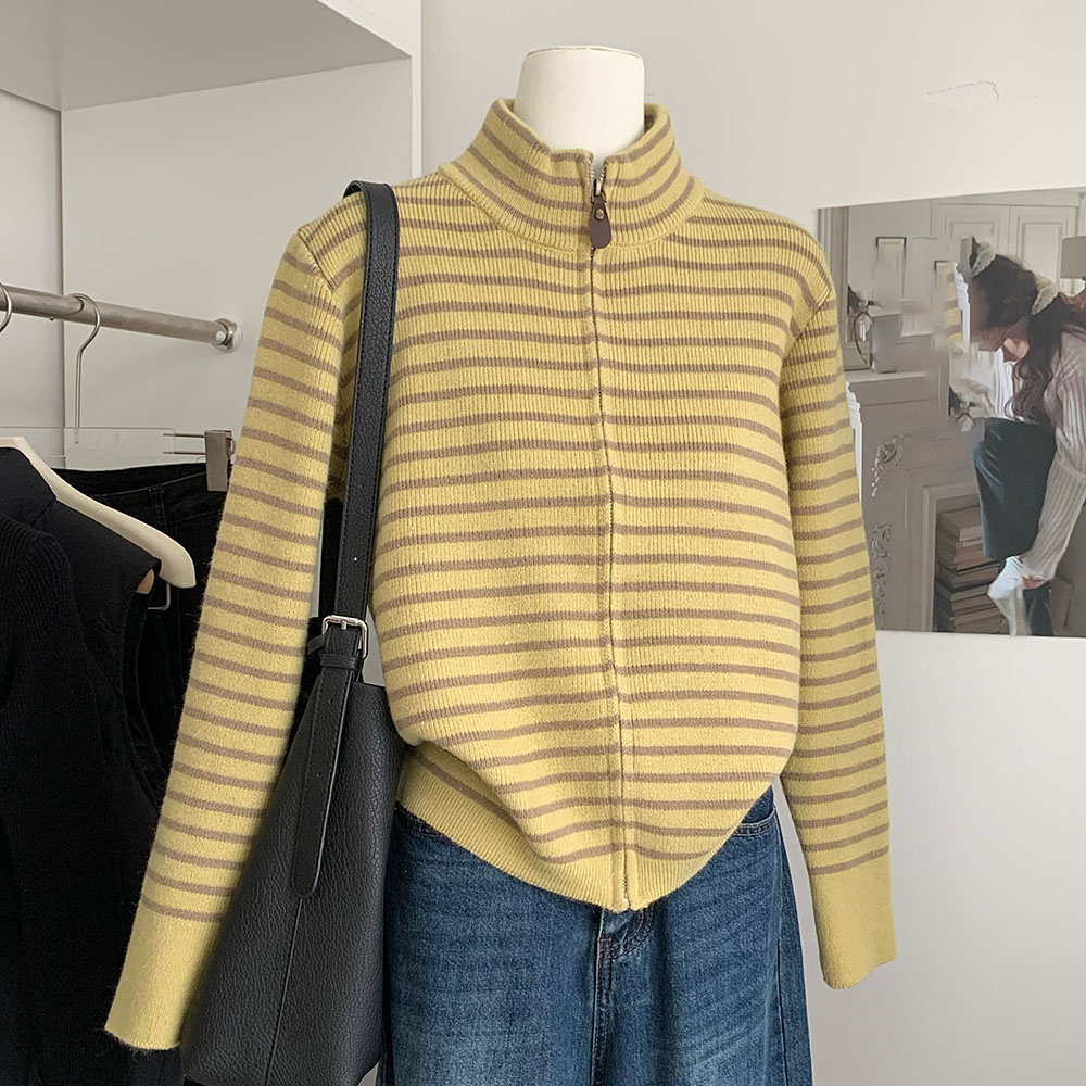 Belknt-Half Neck Collar Stripes Knitted Cardigan Knitted for Women-Spring Autumn Zipper Sweater Short Coat-French Style Tops Outfit