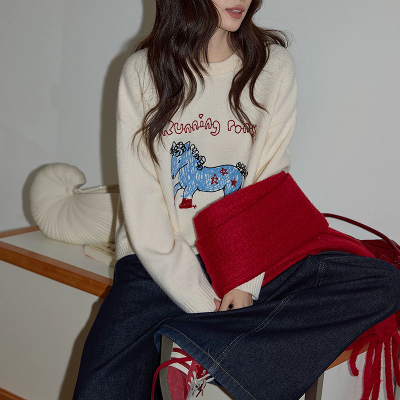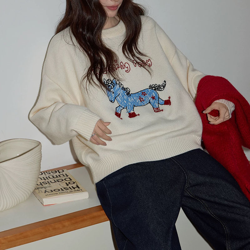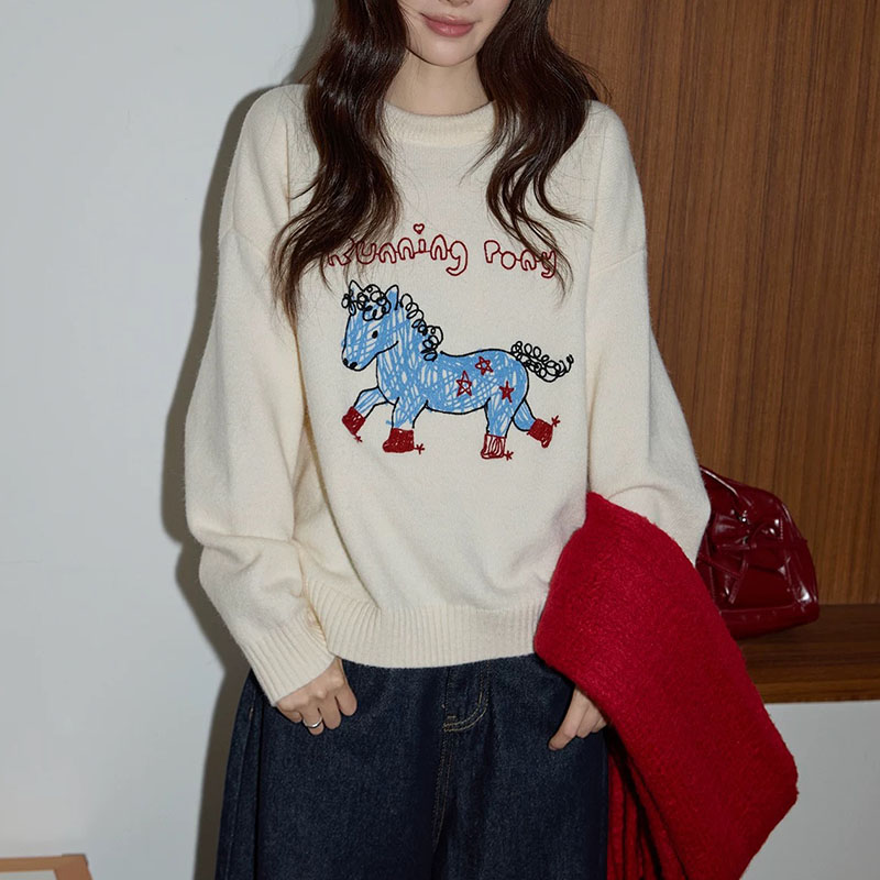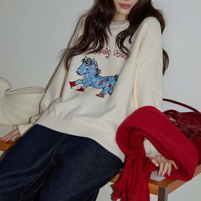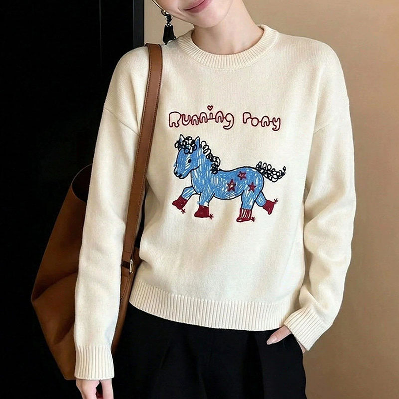 Belknt-Little Horse Embroidery Pullover Knitted Sweater Top for Women-Sketch Cartoon Loose Crew neck Coat Knitwear for Girls