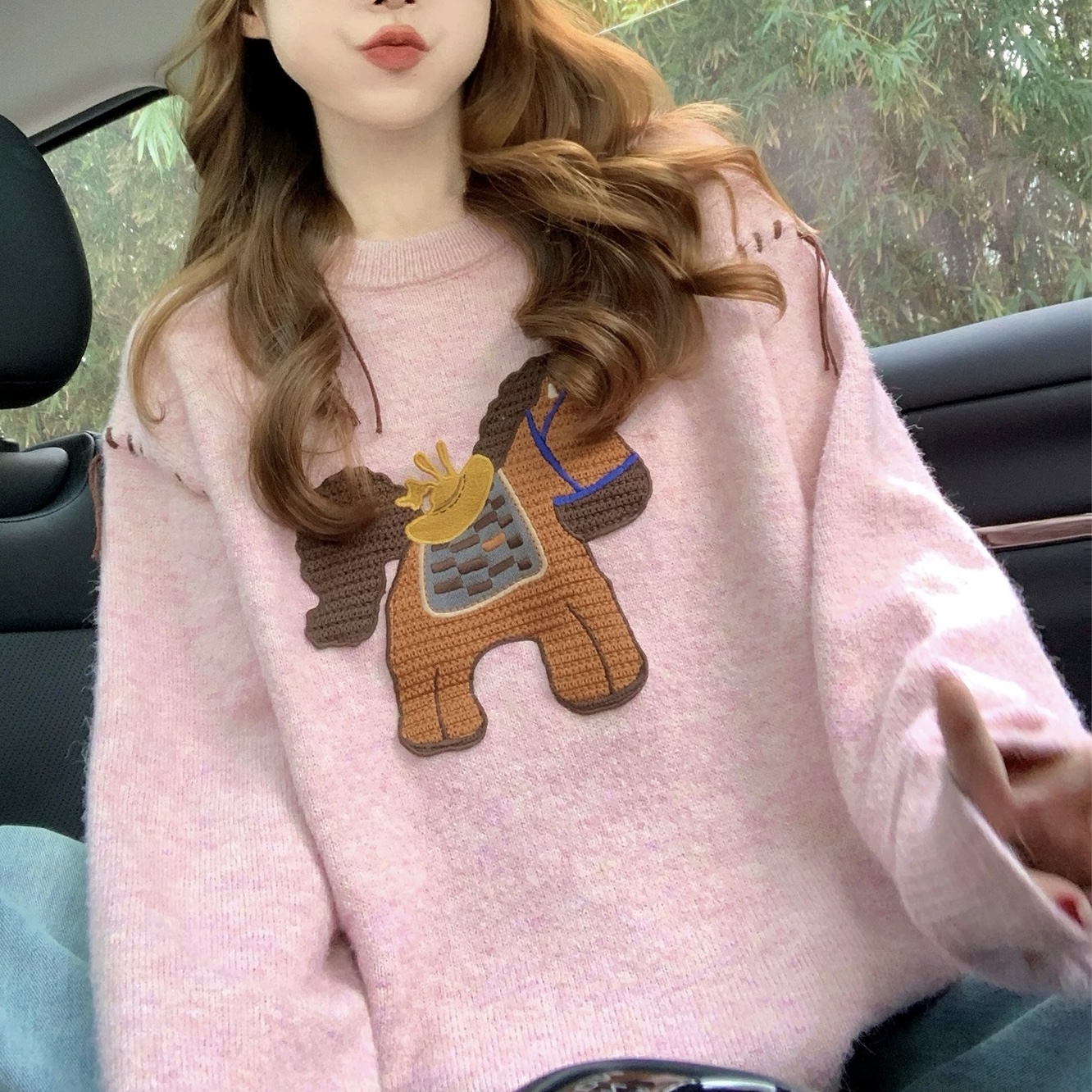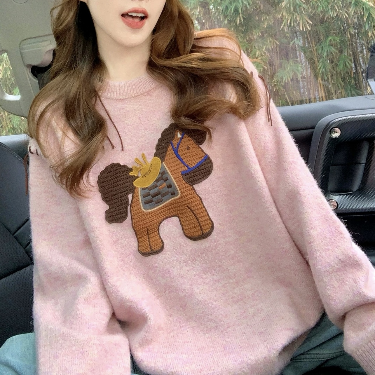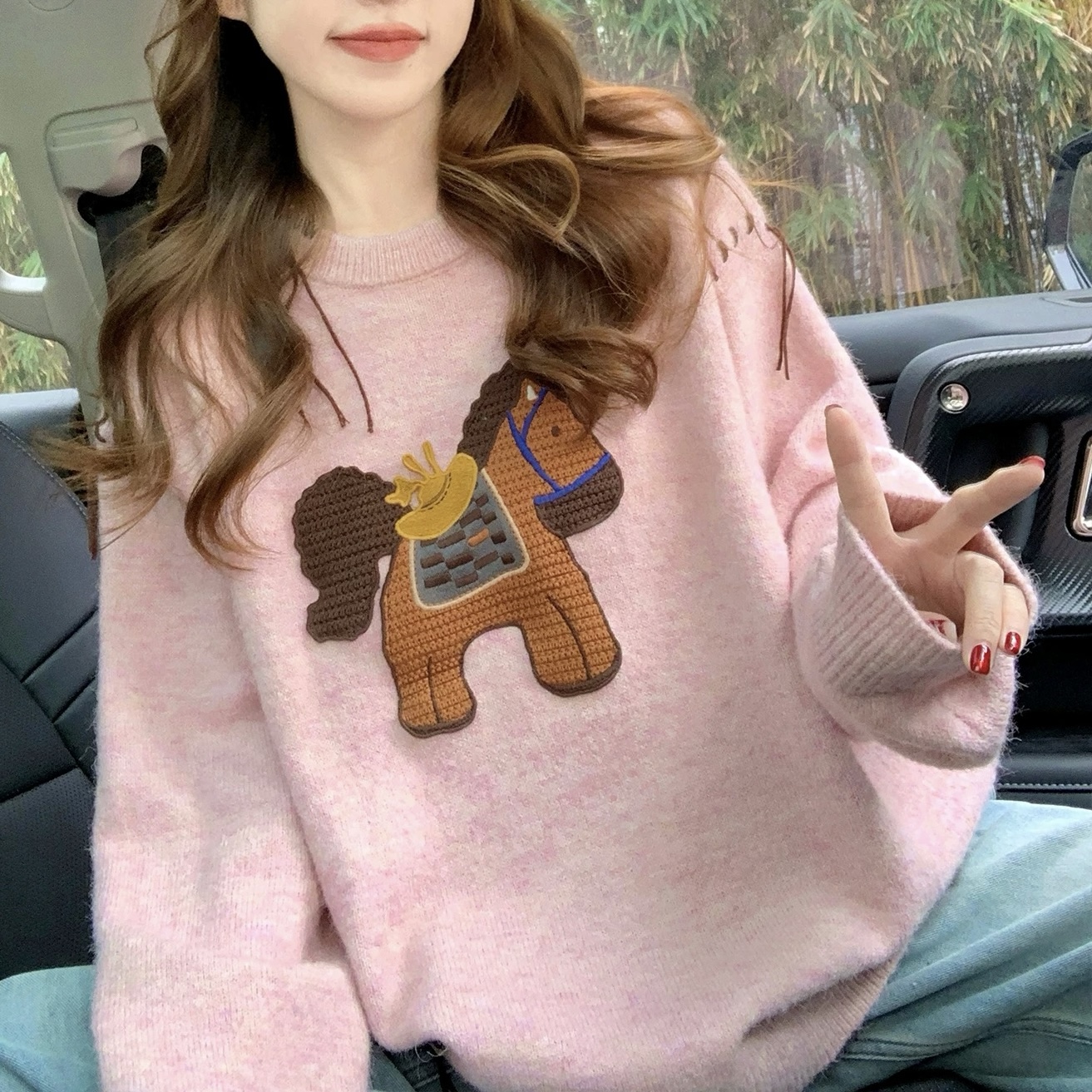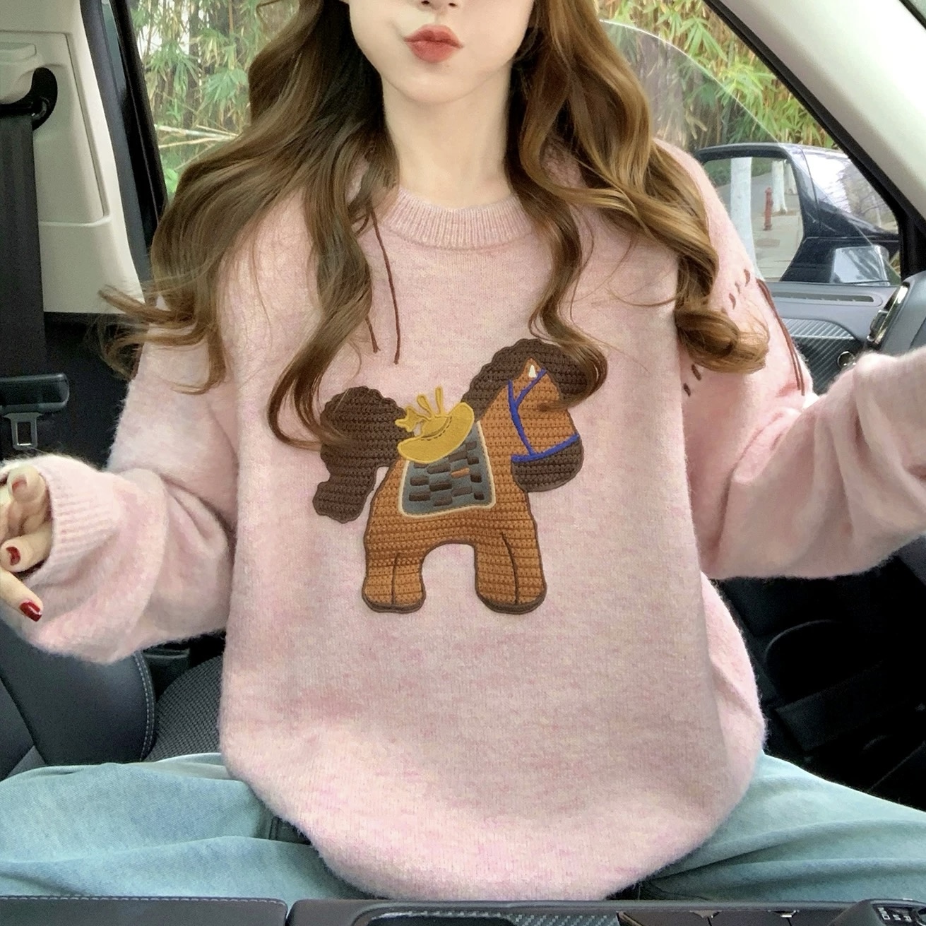 Belknt-Pink Embroidery Pullover Knitted Sweater Top for Women-Loose Long Sleeve Horse Crew neck Coat Knitwear for Girls