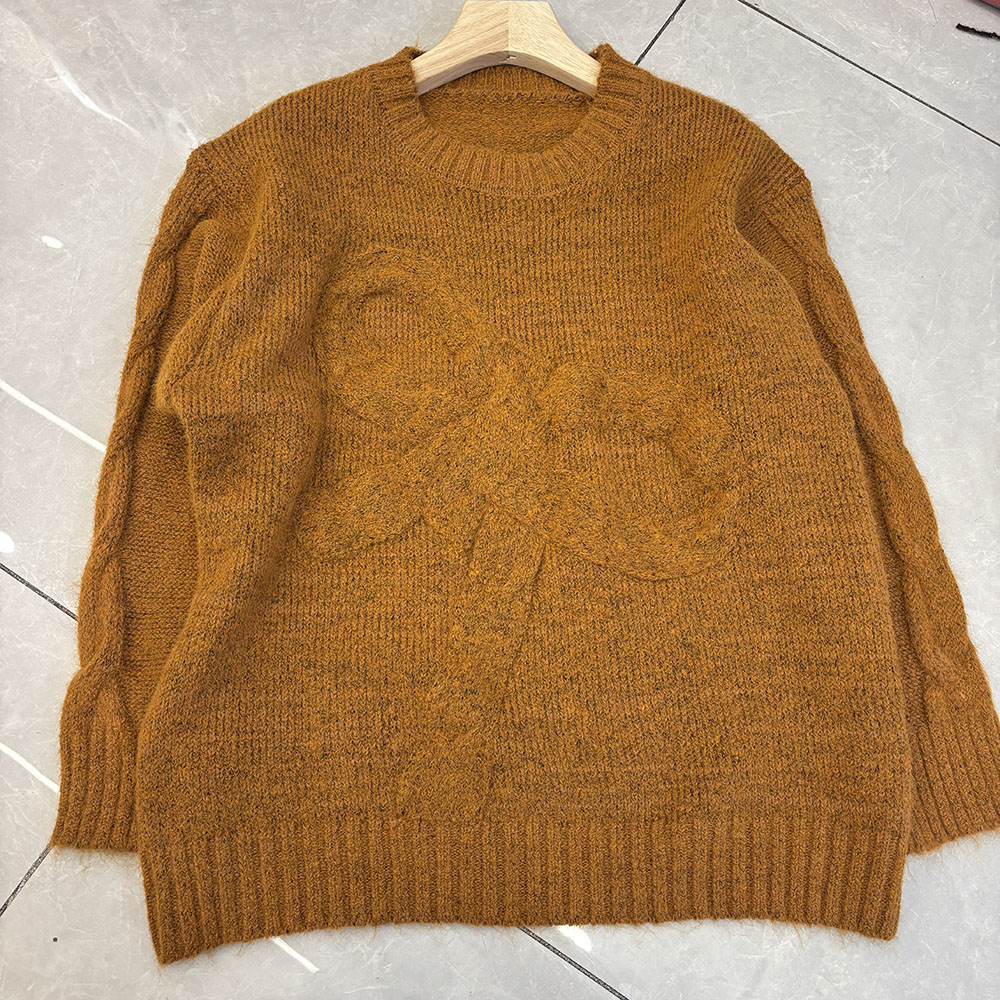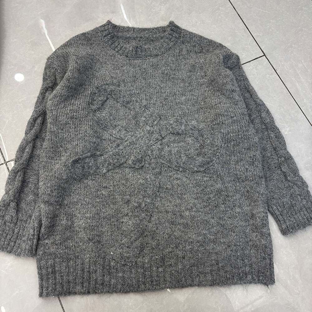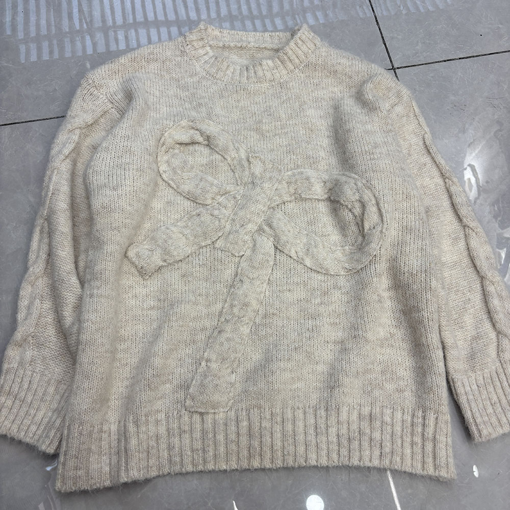 Belknt-Solid Three Dimensional Bow Pullover Knitted Sweater Top for Women-Loose Thick Long Sleeve Round neck Coat Knitwear for Lady