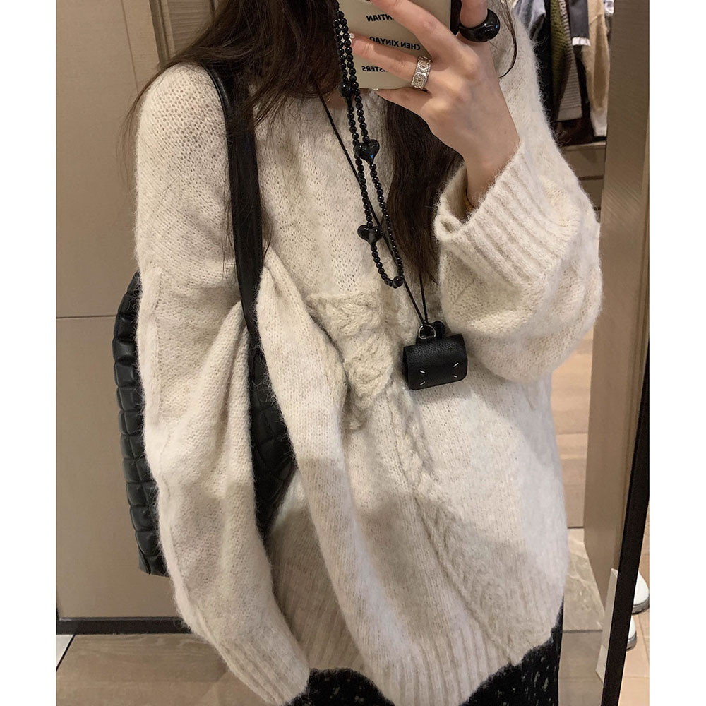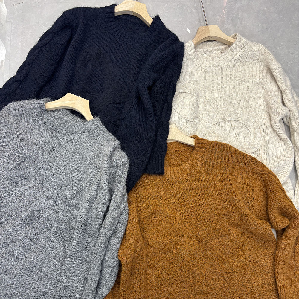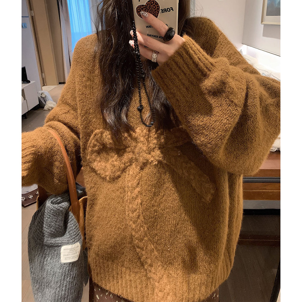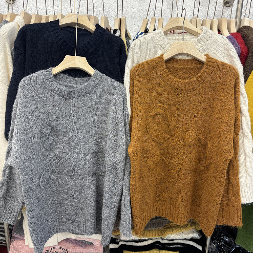 Belknt-Solid Three Dimensional Bow Pullover Knitted Sweater Top for Women-Loose Thick Long Sleeve Round neck Coat Knitwear for Lady