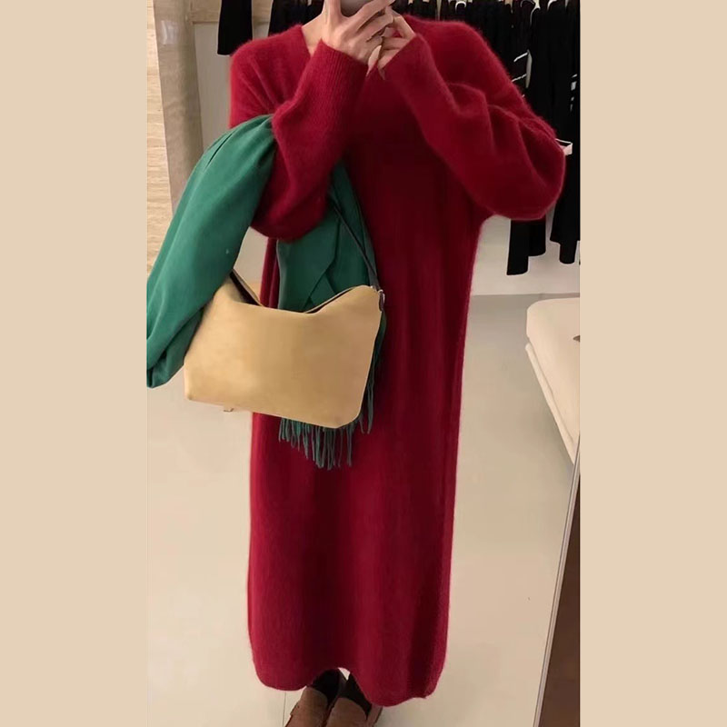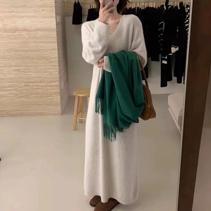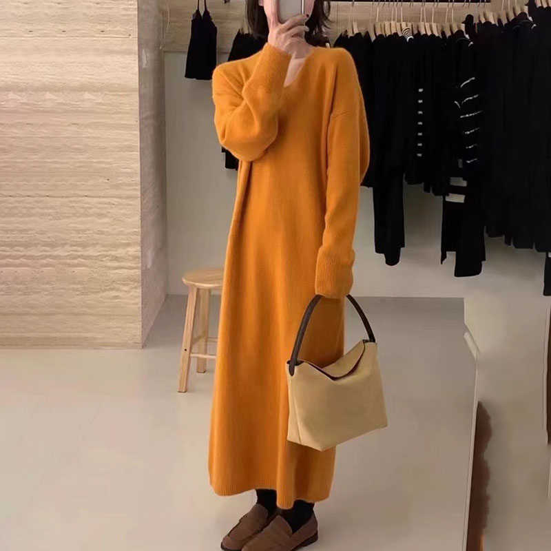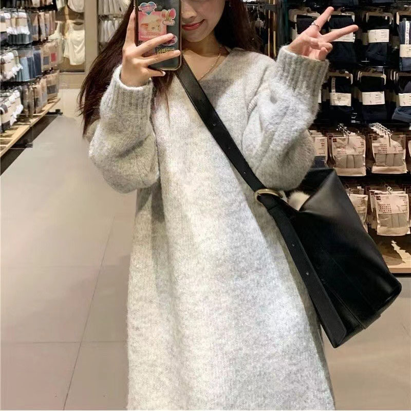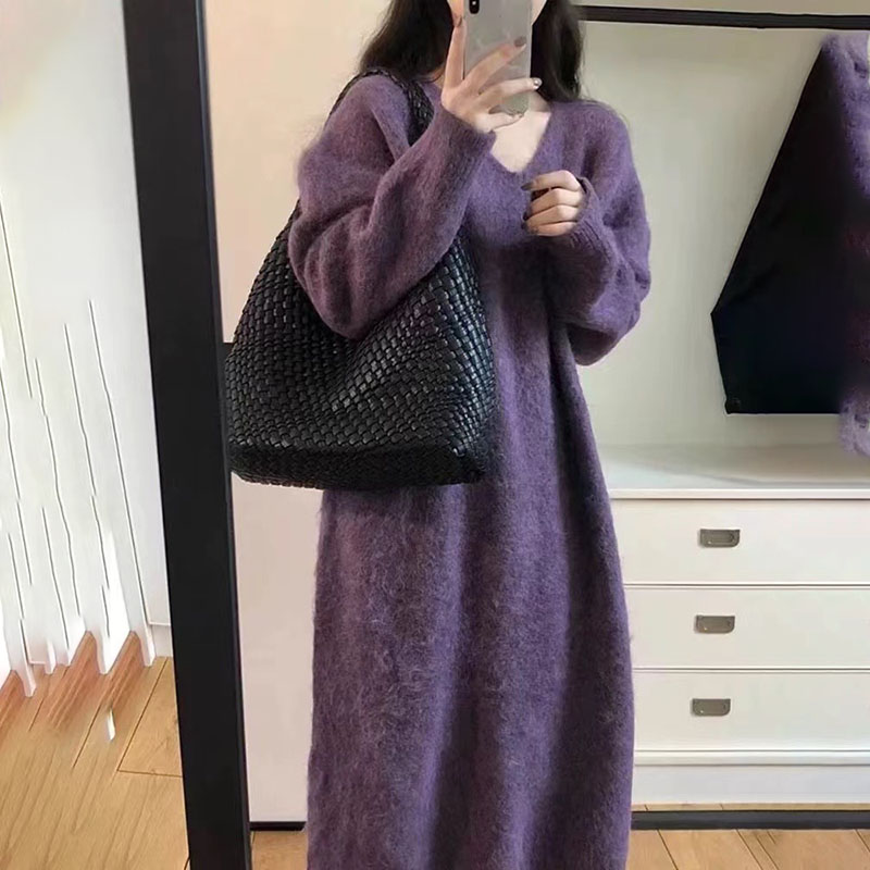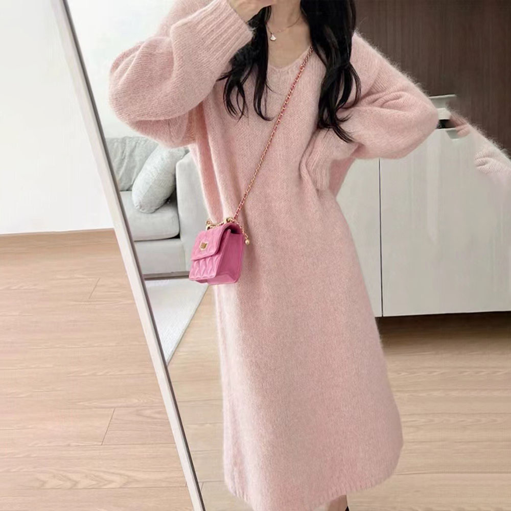Women‘s Knitted Dress, Pink V neck Pullover Sweater Over the Knee, Straight Silhouette Outwear Tops, Soft, Comfortable,