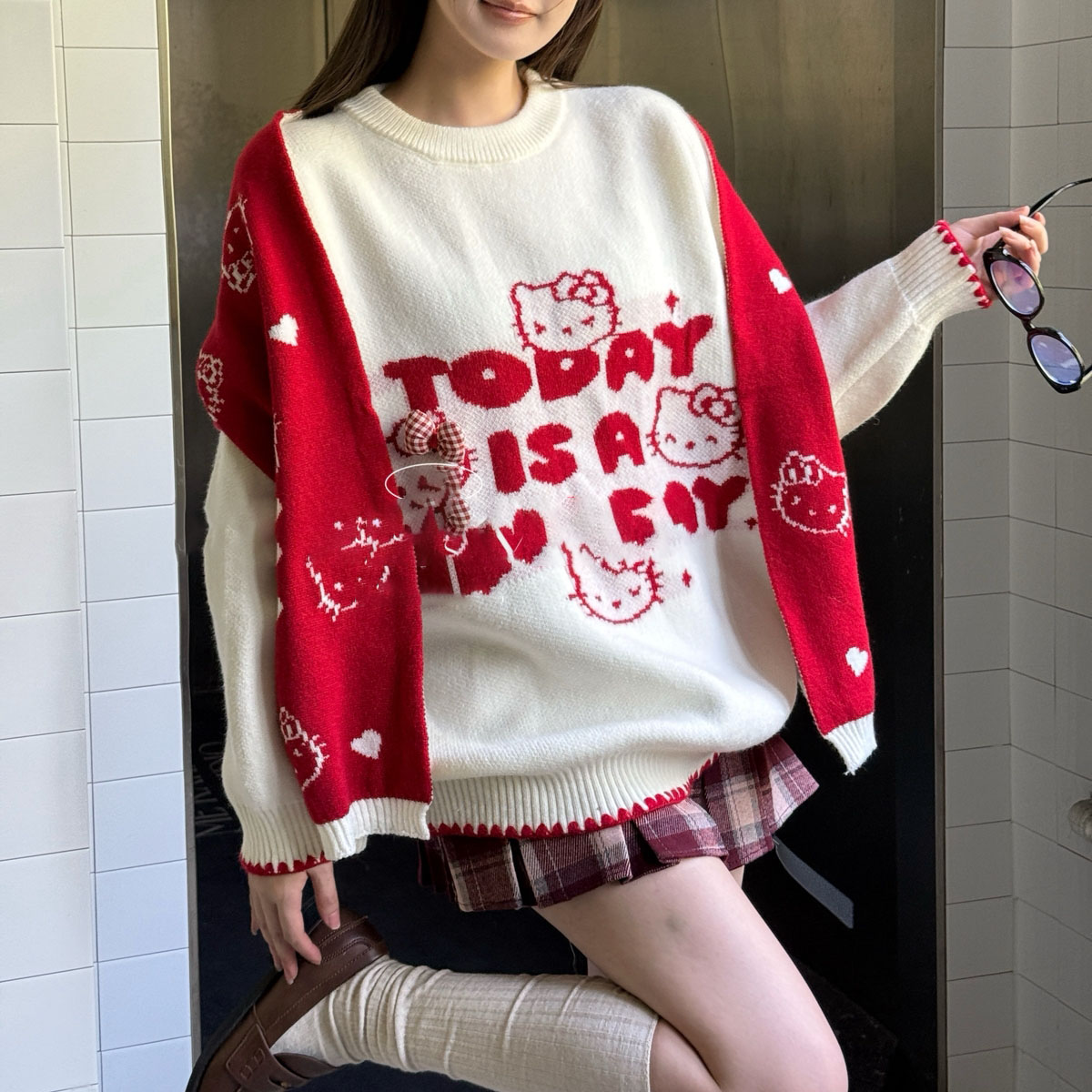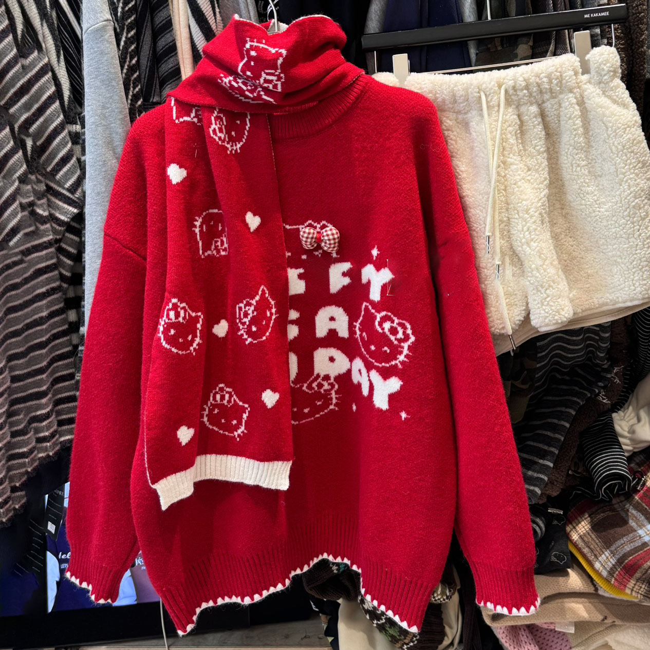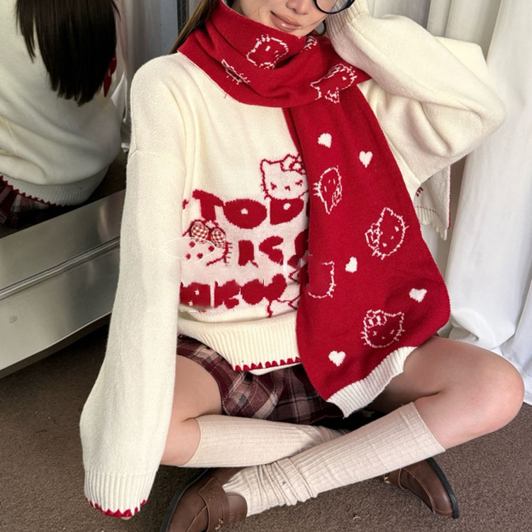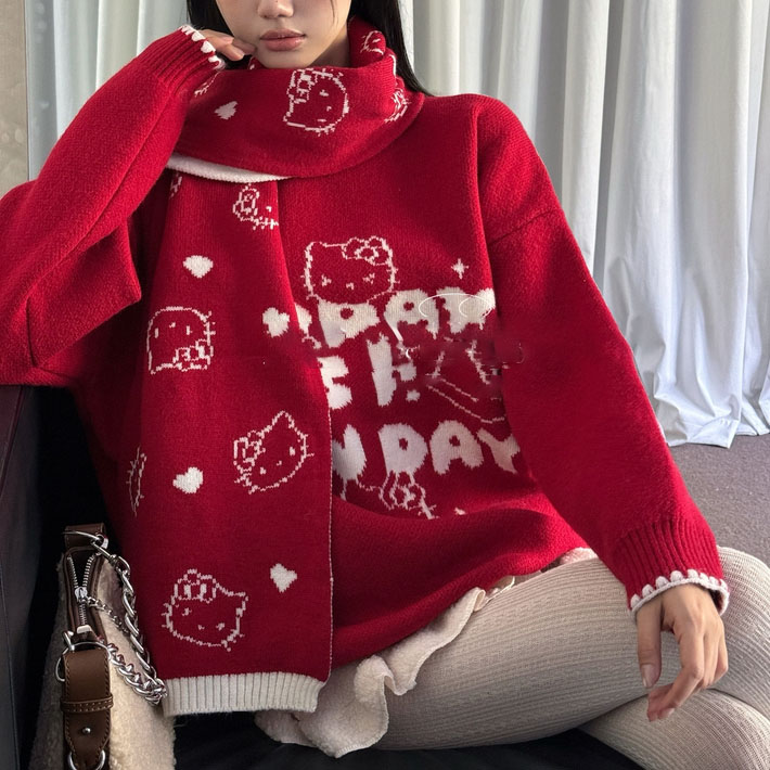 Belknt-Women‘s Knitted Pullover Knitwear-Two Piece Round neck Pullover Sweater Coat with Scarf-Cartoon Jacquard Tops-White Red Knit Suit